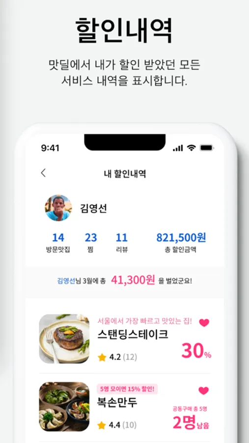 맛딜앱에서 내가 할인 받은 금액 및 모든 서비스 내역을 조회합니다.