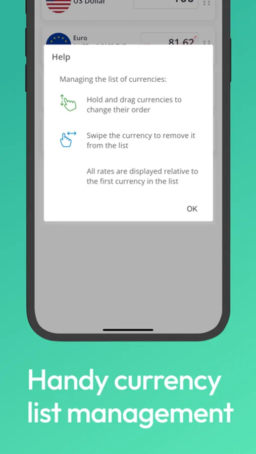 Add several currencies at once to the main screen of the application. Specify the price in any currency and the application will automatically recalculate the price in all other selected currencies. Use drag and drop to sort the list and swipe right to remove currency.