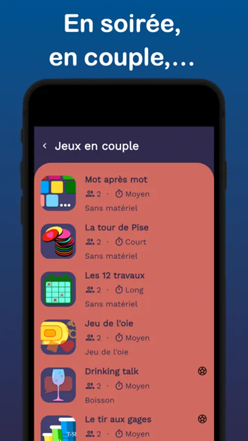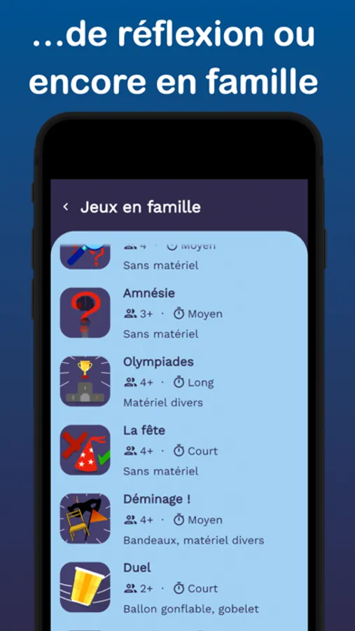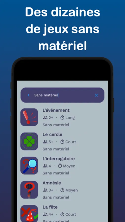 Nous avons pris soin d'inclure de nombreux jeux jouable sans matériel, ou avec du matériel très basique, et ce dans toutes les catégories. Ainsi, profitez de jeux amusants en toute occasion, même lorsque vous êtes à l'extérieur !