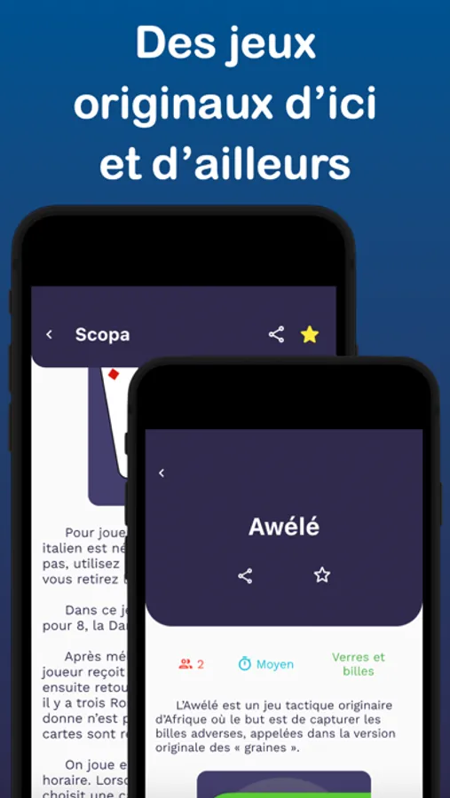 Les jeux contenus dans l'application sortent pour la plupart de l'ordinaire. Certains ont été entièrement inventés par notre équipe, d'autres sont des versions revisitées de jeux plus connus. D'autres proviennent de pays lointains, comme l'Inde, les États-Unis ou encore le Japon. Enfin, certains sont des jeux anciens à redécouvrir, parfois classés au patrimoine immatériel de l'Unesco.