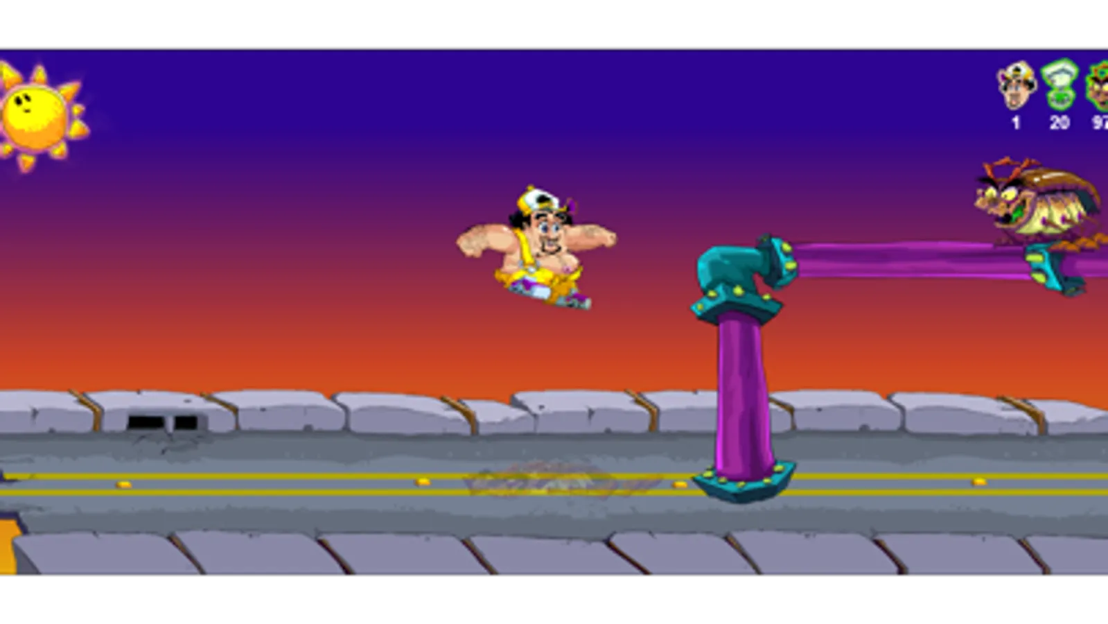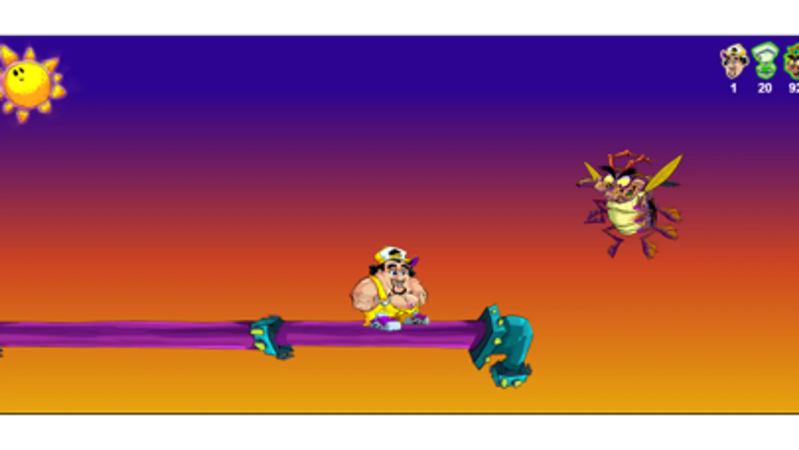 2D animation platformer, play as a funky plumber and unclog toilets and stomp on roaches.