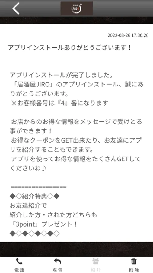 居酒屋JIROのアプリをSNSを通じてお友達に紹介する事ができます。