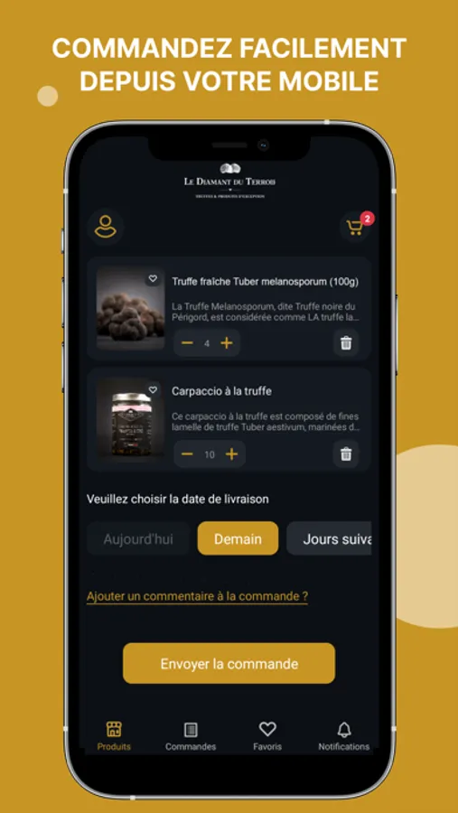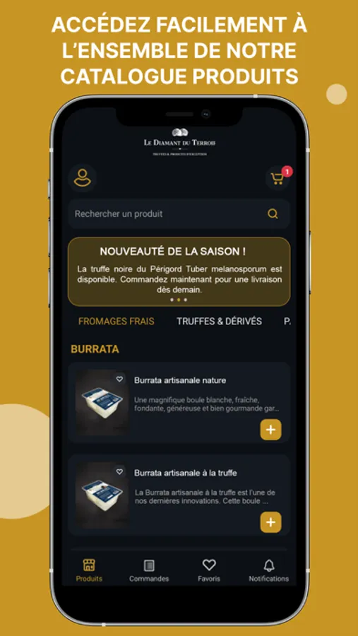 C’est dans cet esprit-là que nous proposons l’application Le Diamant du Terroir : un service digital innovant qui s’intègre facilement dans le quotidien de nos clients afin de simplifier la prise et gestion de leurs commandes.