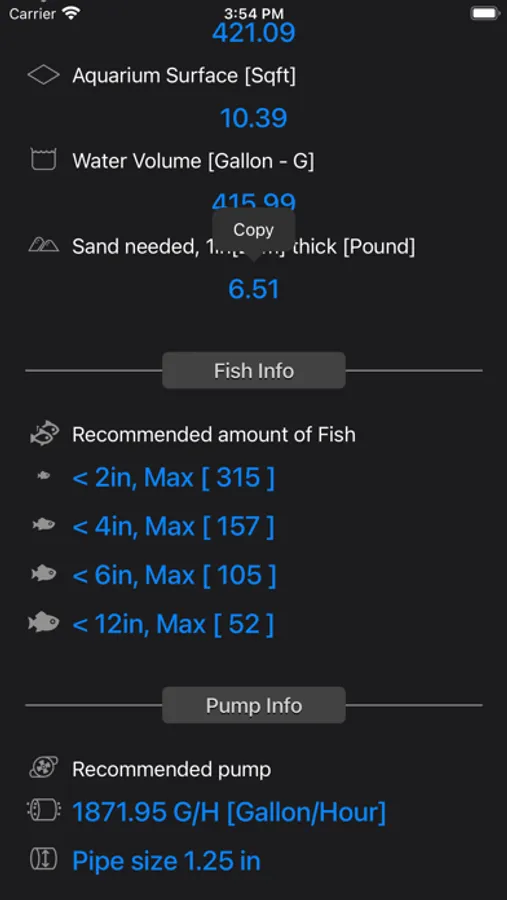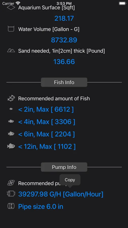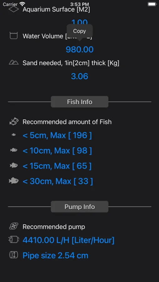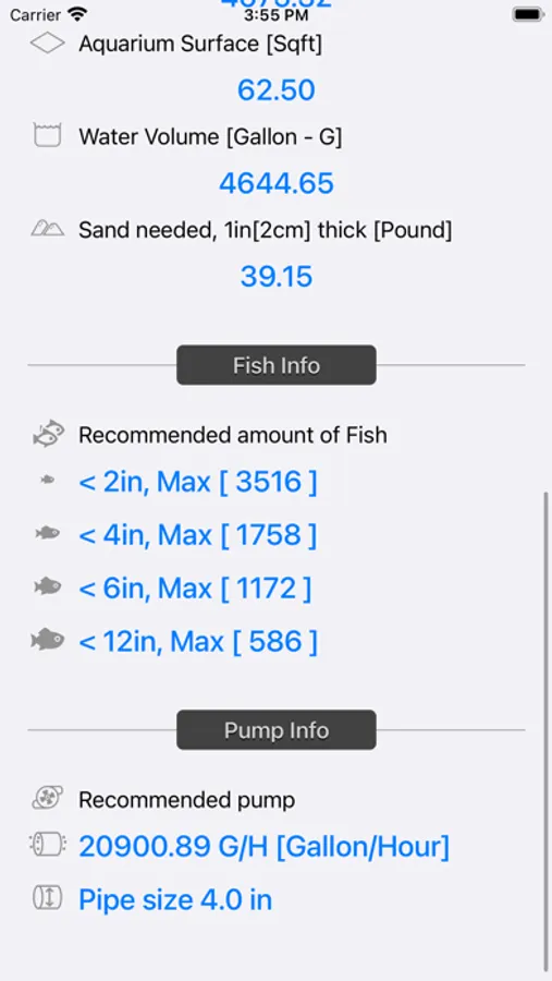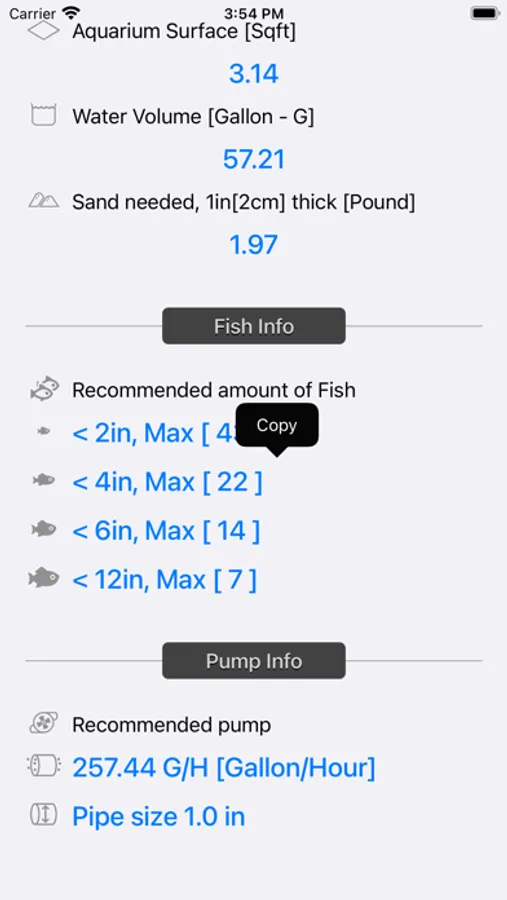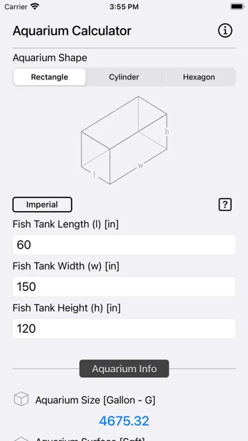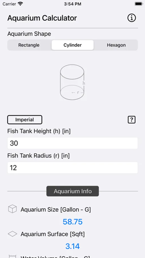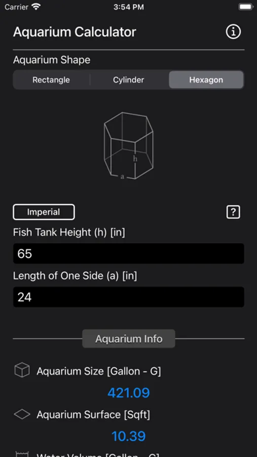 • Calculate the volume in square, rectangular, cylindrical or hexagon aquariums.