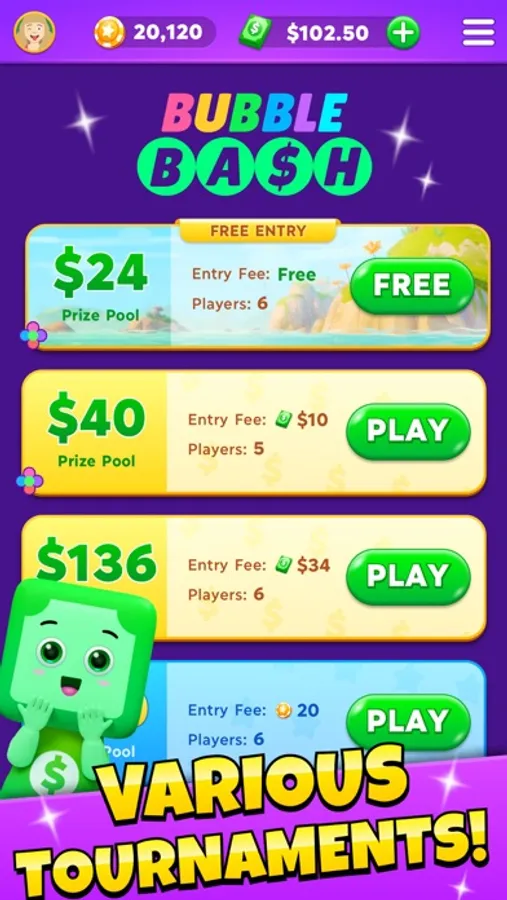 Download Bubble Bash for FREE and participate in the real cash tournaments to win real money! Victories depend on three key factors: Strategy, Skill, and Lightening Fast Reflexes.