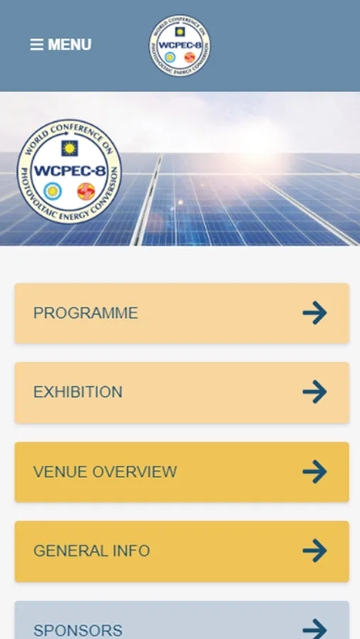 The European PV Solar Energy Conference and Exhibition (EU PVSEC) presents you this app on the occasion of the 8th World Conference on Photovoltaic Energy Conversion. With this app you can: -Browse, search and view the Scientific Programme of the WCPEC-8- Create your personal programme - Find conference rooms and exhibitor stands- Browse the List of all Parallel Events and add them to your personal schedule- Find a list of all our exhibitors, sponsors and partners- Receive push notifications for upcoming sessions WCPEC-8 in your pocketThis app simplifies your attendance at WCPEC-8 by guiding you through the Milano Convention Centre to your chosen session and giving you an overview of the extensive programme WCPEC-8 has to offer.Look forward to exciting scientific sessions discussing the latest research findings in the global PV solar energy sector, in-depth insights into specific PV topics in Parallel Events and interesting Industry Presentations covering the latest market trends, and much more...See you in Milan!