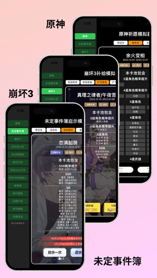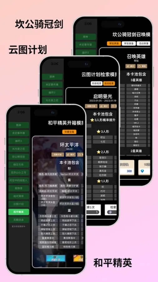 1. 辅助模拟各大游戏的抽卡,包含全面的数据统计直观反映抽出心仪的内容需要的成本。