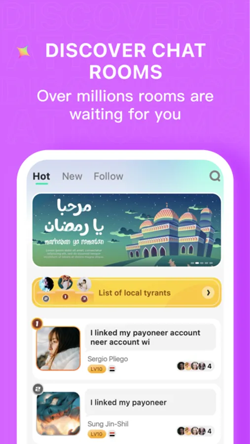 Meet new friends is never easier: Choose group voice rooms from thousands chat rooms daily,filter rooms by countries or topics.