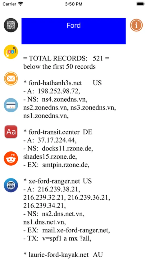 - For domains, the "Info" button (i) is used to get information about the domains containing this word.
