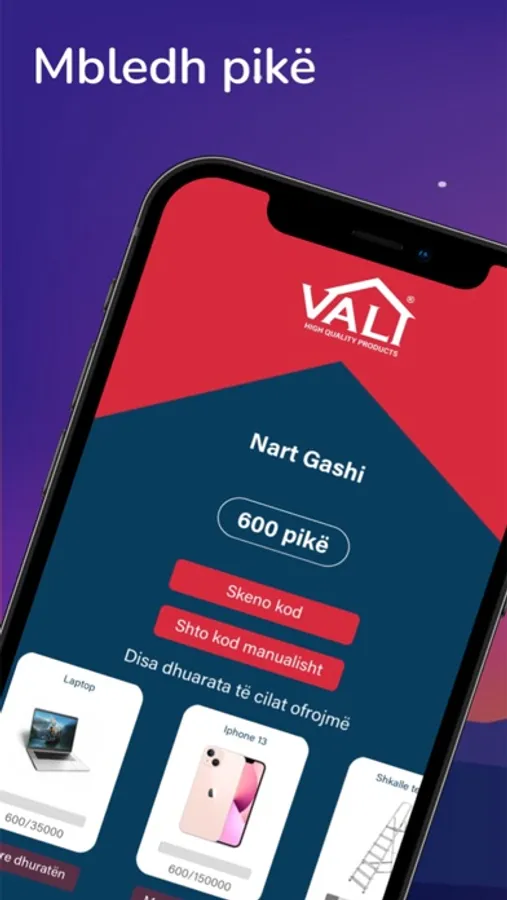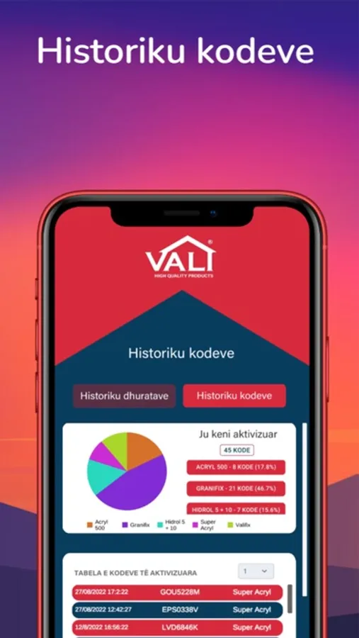 Me aplikacionin Valipik, tani mund të lidheni me llogarinë tuaj ekzistuese Valipik përmes numrit tuaj të telefonit ose të krijoni një llogari të re. Duke përdorur këtë aplikacion, ju mund të aktivizoni kodet që gjeni në produktet tona, të shihni të gjitha dhuratat që ofrojmë, të merrni dhurata, të shihni të gjithë aktivitetin tuaj të kaluar për shembull, kodet që keni aktivizuar më parë, dhuratat që keni marrë më parë dhe shumë më tepër dhe gjithashtu mund të shihni produktet që përmbajnë Valipik, në një mënyrë shumë të lehtë!
