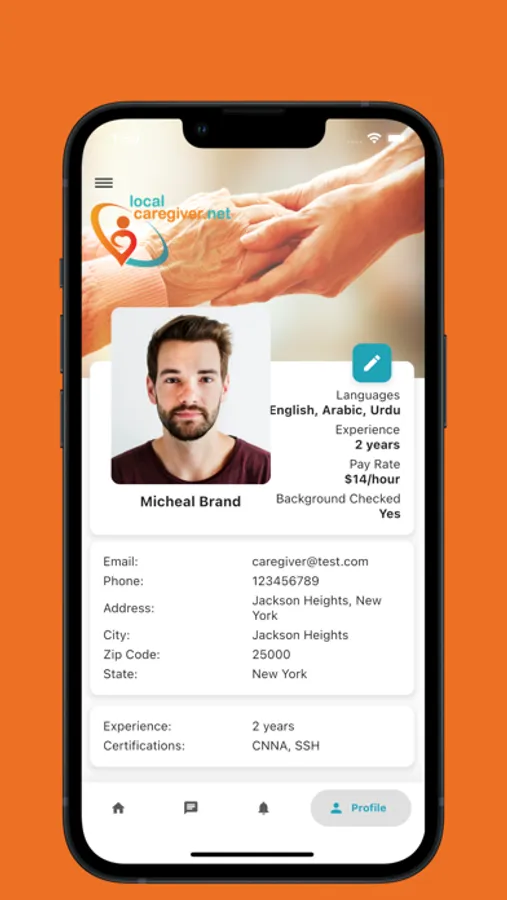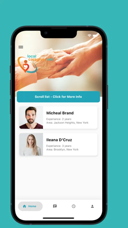 The local caregiver app is a way for those who are seeking an in-home aide to find them in their area. All aides must have a background check to add a layer of security. The user registers then fills out some questions about their needs. The app matches registered aides (caregivers) by availability and proximity to the user. The user is shown a list of aides in their area and selects from the list. The aide is then alerted and messages the user if they want the job.