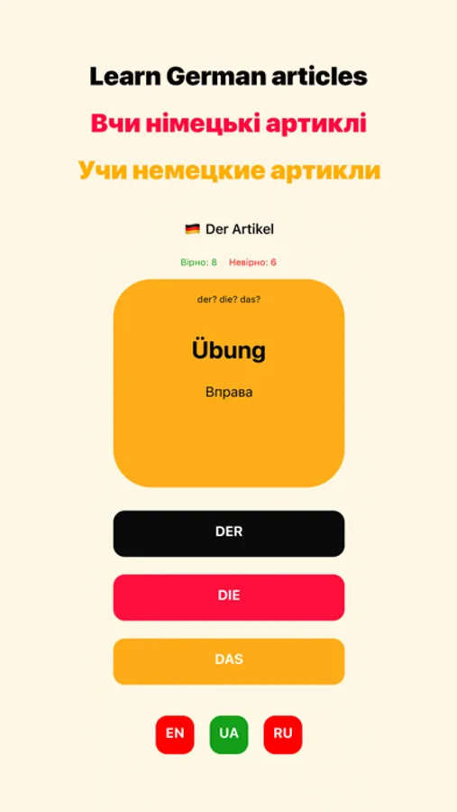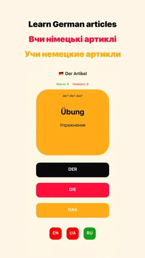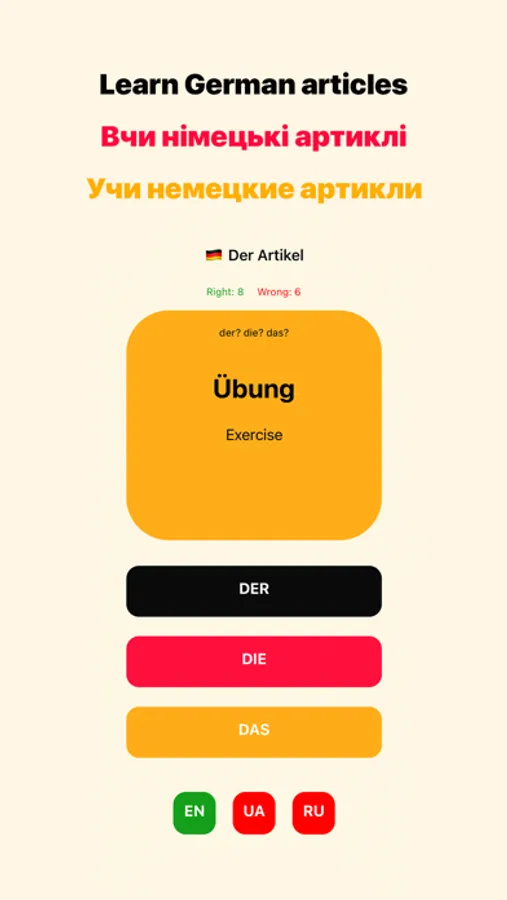 Learning German? There is nothing more important than memorizing the articles. After all, as the Germans say, "artikles are the key to the German language." This app will help you memorize the articles!