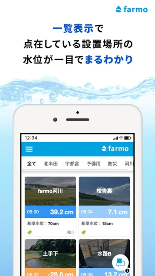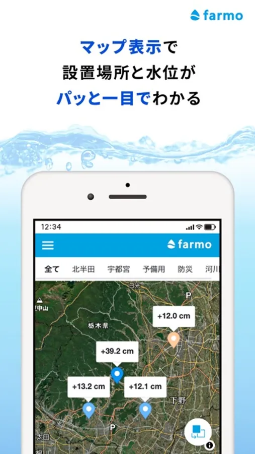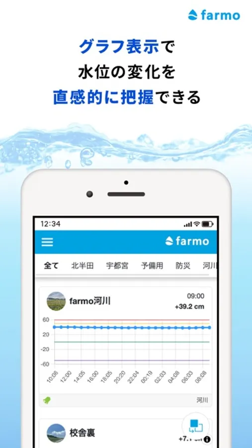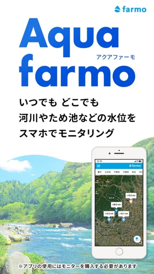 アクアファーモは、河川やため池などの水位をスマホでモニタリングができるアプリです。