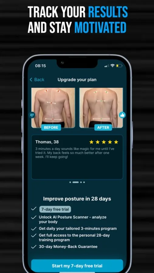 Build an amazing posture, track your process and stay motivated in just a few minutes a day and without any equipment!