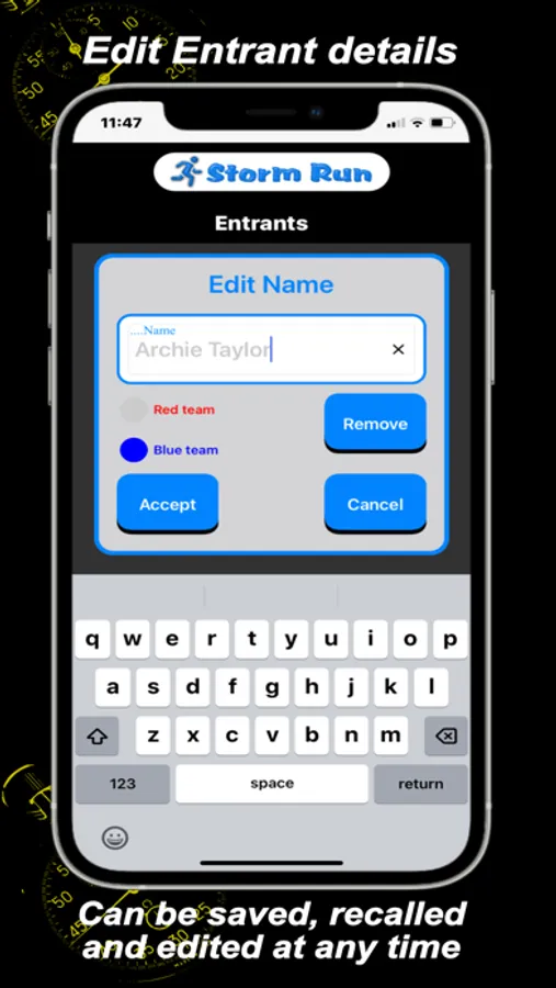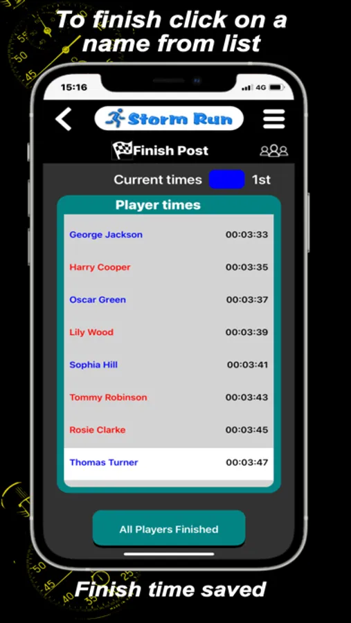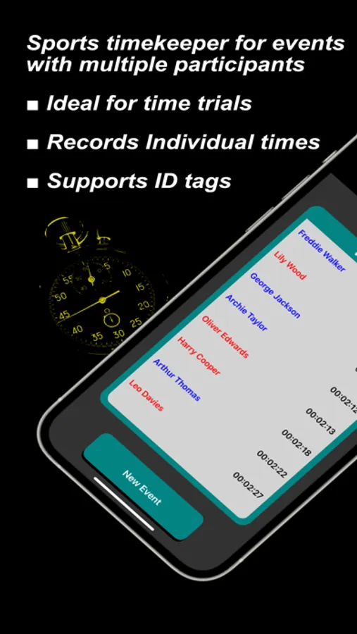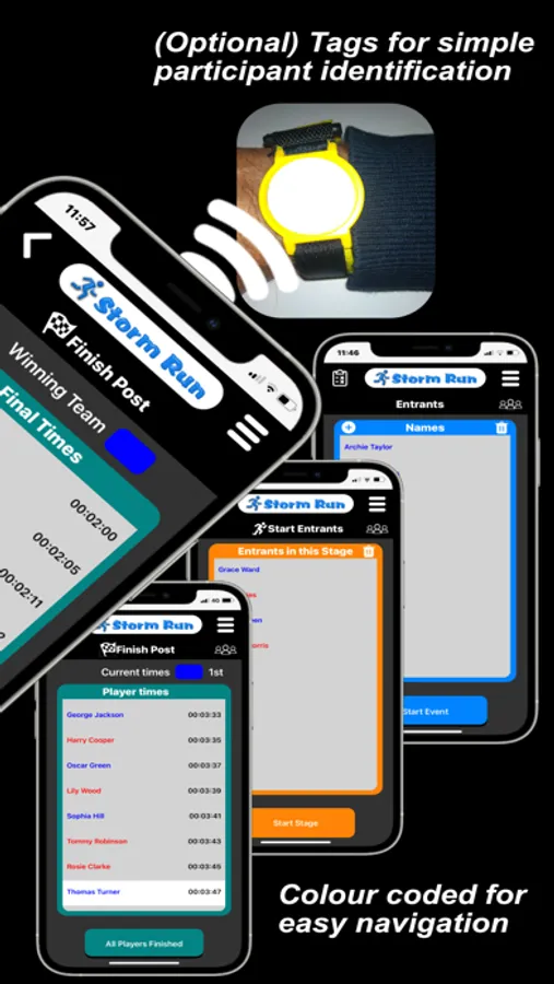 Participants are registered in the App by entering their details (name, number, and team). This information can be allocated to Tags to simplify identification. This information can be saved and recalled later.