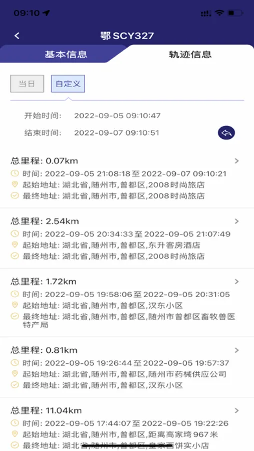 5.车辆的历史轨迹可以在轨迹信息中方便的查看,还能自定义时间段查询~