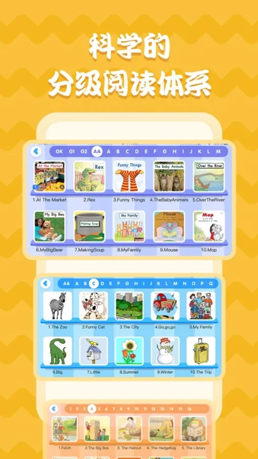 从A~Z级,根据小朋友的年龄和兴趣,科学推荐适合的阅读内容。