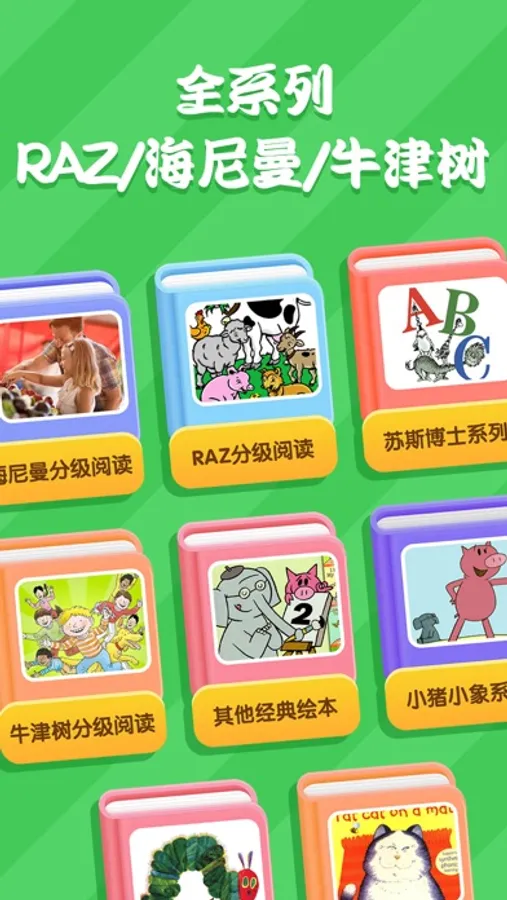 内容丰富:经典绘本、廖彩杏书单全阶段、 牛津树、海尼曼分级读物GK、兰登分级阅读等。