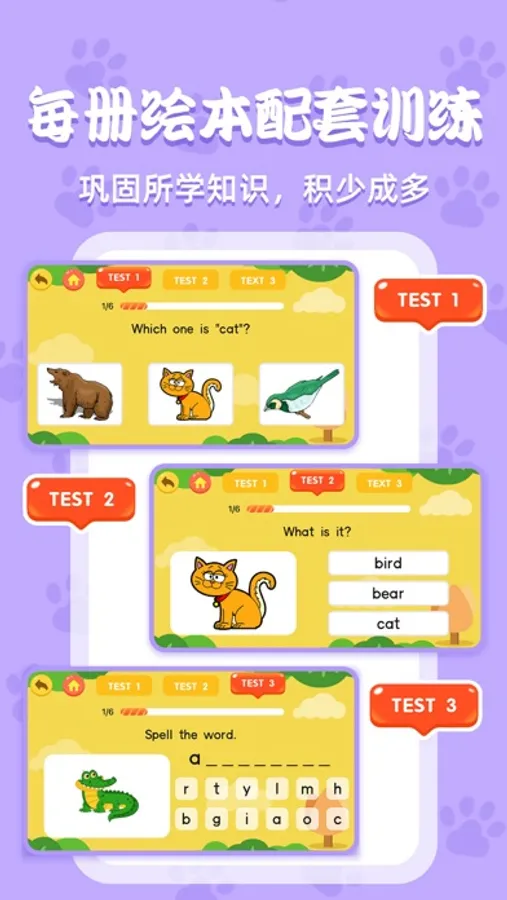 内容升级:对每一册绘本整理出对应常用单词,进行专项训练。绘本阅读→重点词汇→专项练习。学习英语,快人一步。