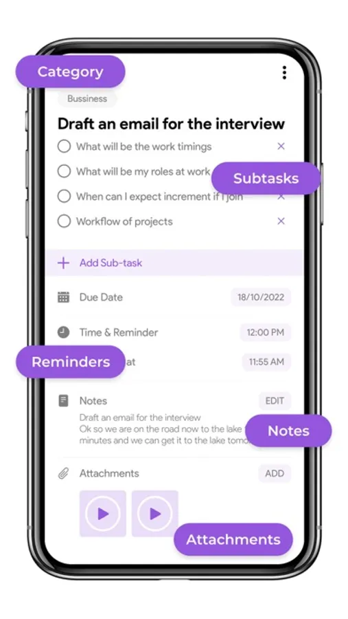 Add them by typing or voice input. With Smart Date Parsing, the date info you enter will be automatically set as the due date for task reminders with a notification. Stay as productive as you can with this time manager and to-do checklist!