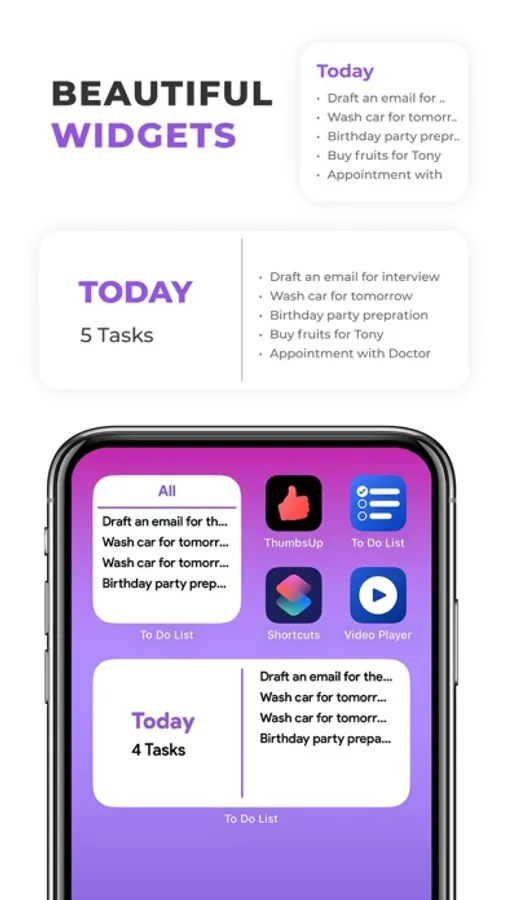 Instead of keeping all things in mind, put them into the "To Do List" app. It will remember everything for you and provide instant task to-do list reminders, for you to get. Set multiple notifications for important tasks and notes to never miss any deadline!