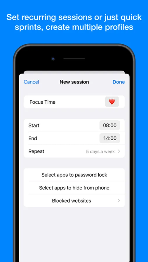 You can set recurring sessions or just quick timers and you can create multiple profiles - leave your device down and disconnect during work or school hours, hangouts or personal time.