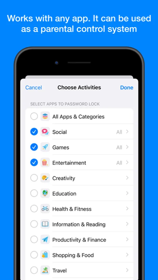 • Disconnect, take a break: Overcome screen addiction. Lock or block addictive apps, block websites. Set screen time limits for yourself or family members