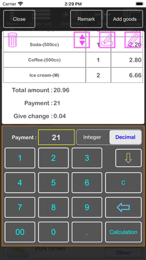 - Payment amount quick input and calculation panel.