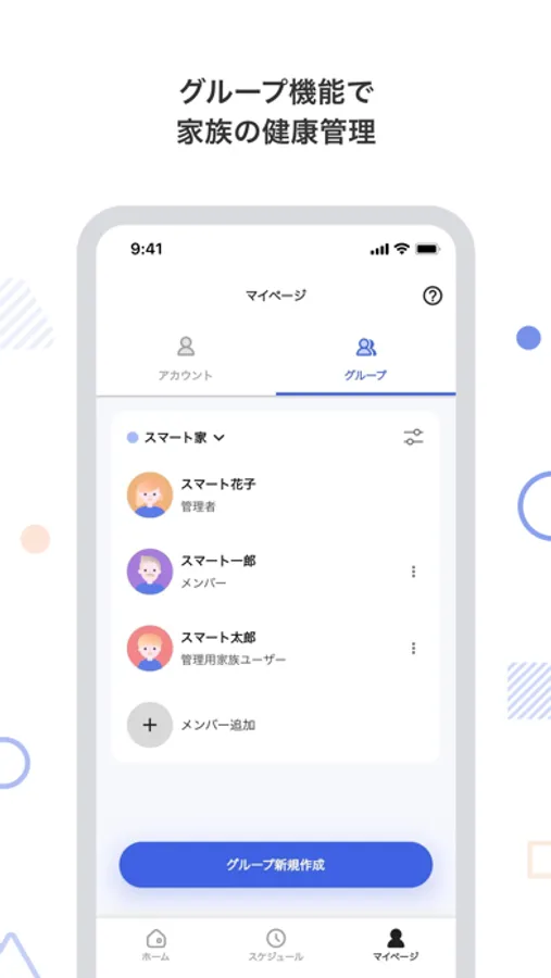 ・グループ機能・管理用ユーザー作成機能で家族の健康管理もスマホでできます