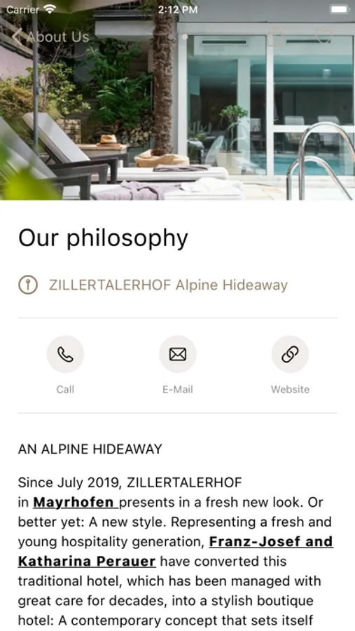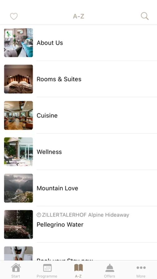 Important standard information about the ZILLERTALERHOF, such as location and directions as well as opening hours of all public areas such as restaurants, bar, HOF SPA and reception, are also prepared for you in the app. So that you can orientate yourself well, you can quickly find all facilities in the hotel and its surroundings with the app.