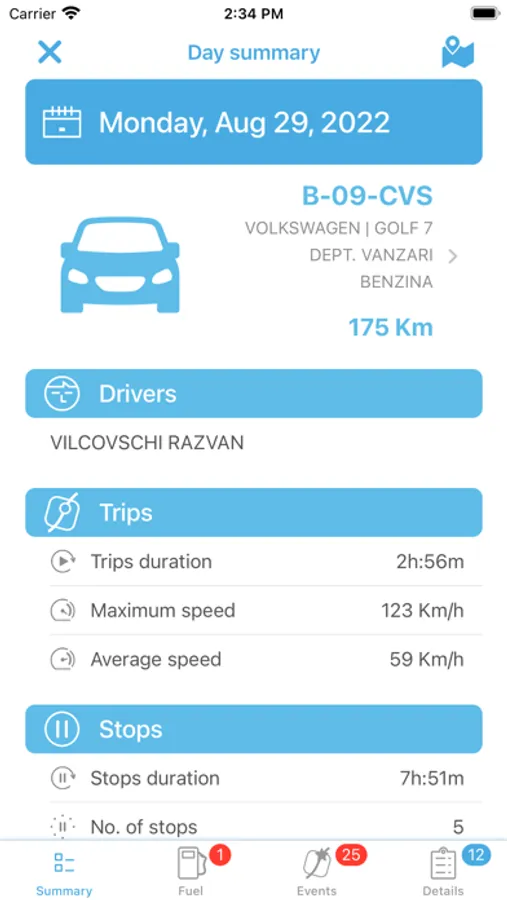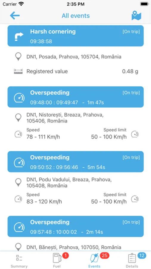 • Keep up with all the vehicles events: overspeeding, green driving, fatigue, seat belt, unauthorized access, lights, door open etc.