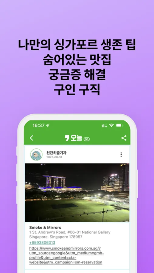 오늘 싱가포르는 싱가폴에 거주하는 한인들을 위한 커뮤니티 소셜 미디어입니다.