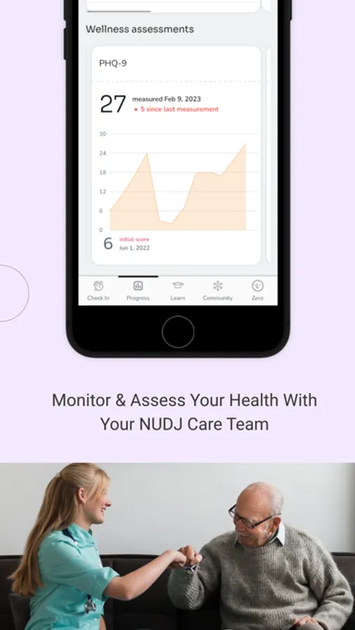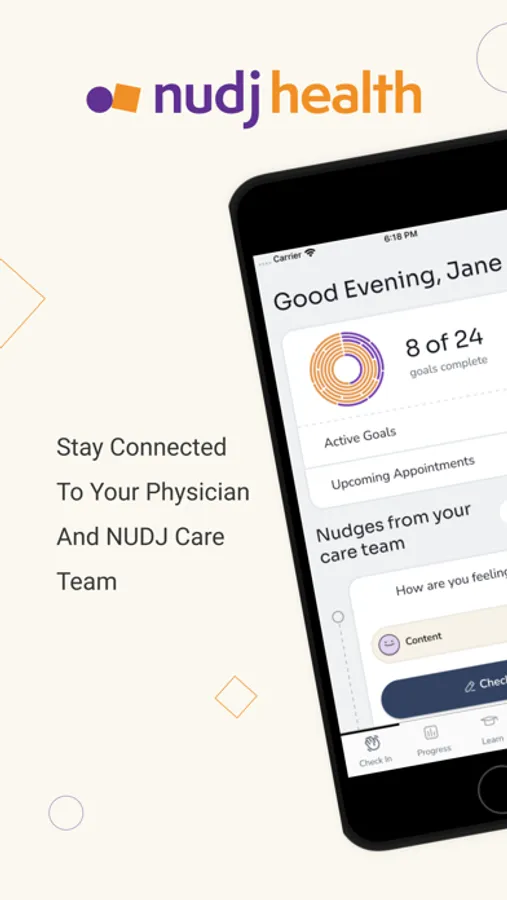 Nudj Health is a unique lifestyle medicine app, that helps you track your health progress in six interconnected lifestyle areas, including your stress, nutrition, exercise, sleep, social support, and behavioral risks like tobacco and alcohol use. In addition, the Nudj Health app allows you to stay connected with your care provider and the Nudj Health team all the time. Clinical evidence shows improving your lifestyle areas can directly improve your physical health, overall wellness, and well-being. Our commitment to improving your health begins with extending our care for you beyond the walls of your doctor’s office in the comfort of your own home.