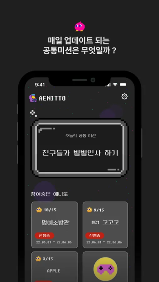- '공통미션은' 애니또를 사용하는 모두가 공통으로 수행하는 미션입니다. 얼굴은 알지만 친하지 않은 사람에게 미션을 수행 해 보세요.