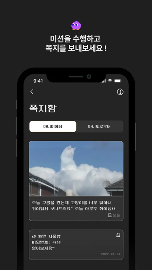 - '쪽지' 기능은 마니띠에게만 보낼 수 있는 일방적인 메시지 입니다. 마니또에게 전달 받는 메세지를 기대해 보세요.