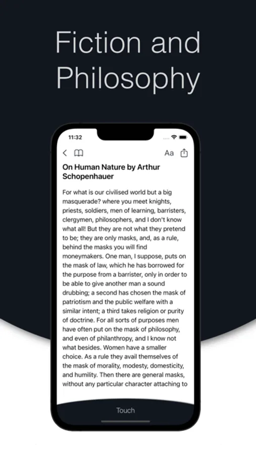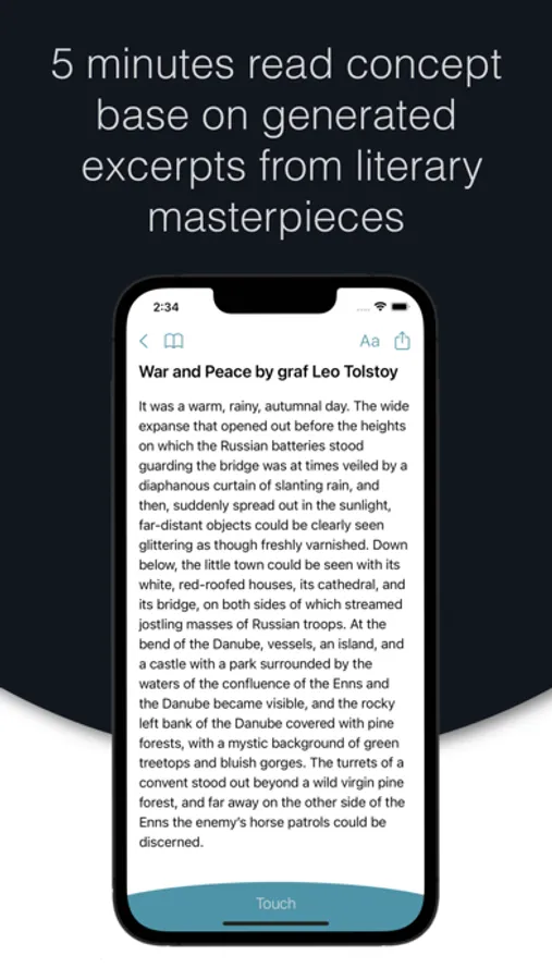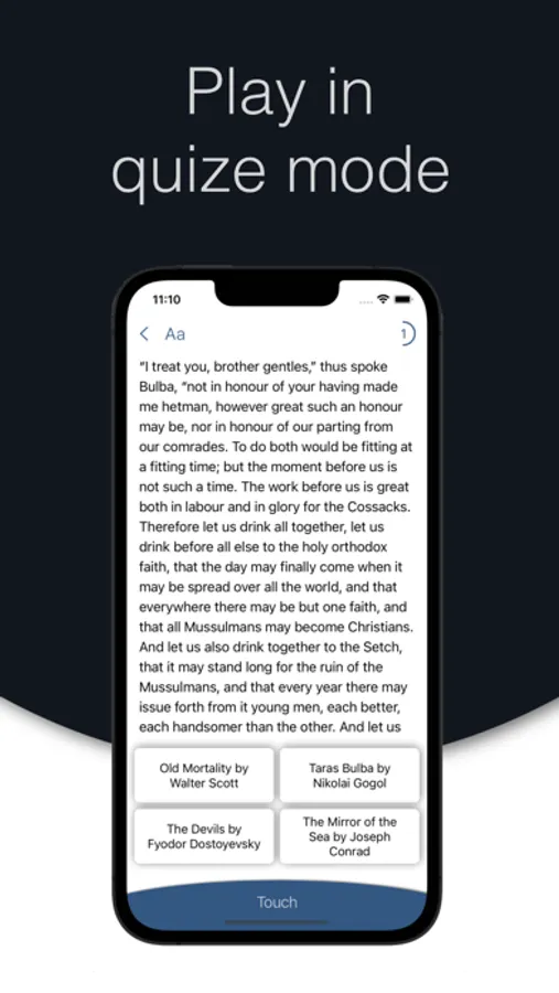 Touch The Classic is made in a concise design, which allows you to focus directly on reading. App has 2 modes. The classic mode allows you to read generated excerpts, select excerpt’s size, and also select a genre: fiction or philosophy. The quiz mode is made like a game in which you have to guess the book among 2 or 4 answer options.