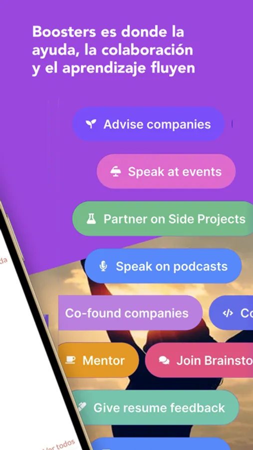 -En Booster podrás aprender y buscar colaboración an áreas de Marketing, ventas, programación, desarrollo de negocio, diseño de producto, finanzas, productividad y bienestar laboral