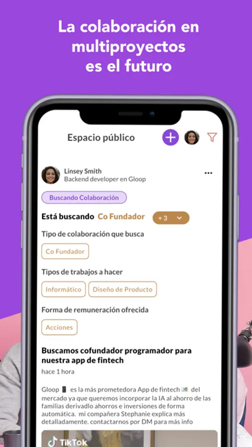 -Encuentra oportunidades de colaboración con otros profesionales. Ofrecete a colaborar en múltiples proyectos con todas las habilidades que tienes o busca colaboradores específicos.