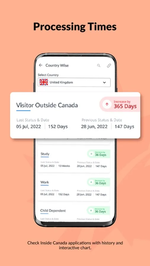 1. Processing times: You can track and see all past processing times with interactive charts for the applications like Inside Canada visitor visa, PR Card renewal and much more.
