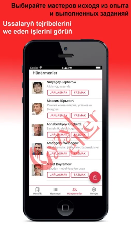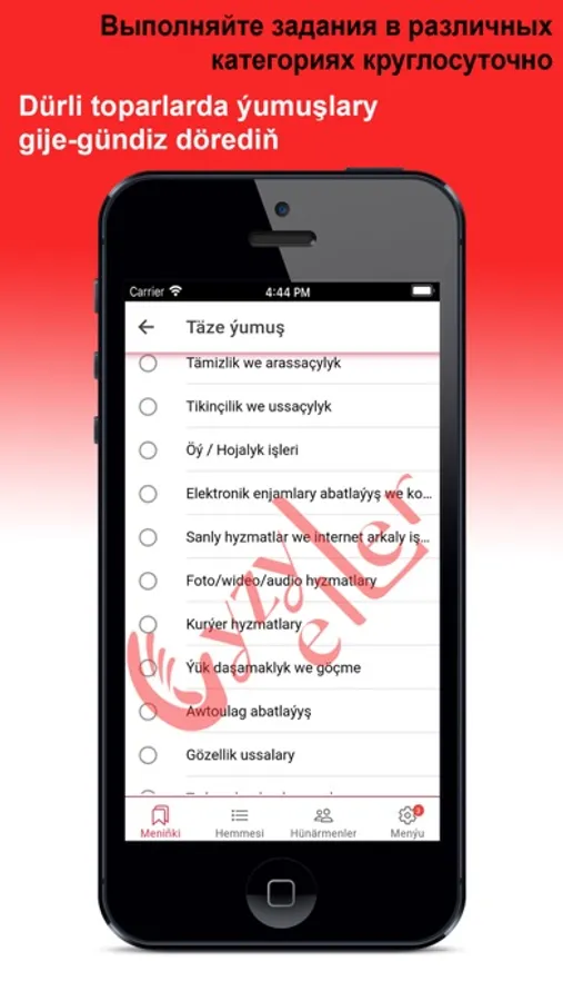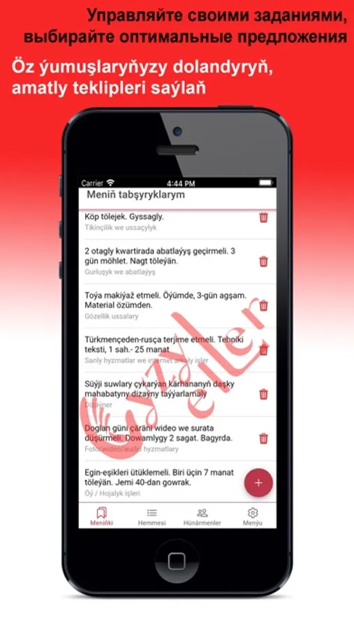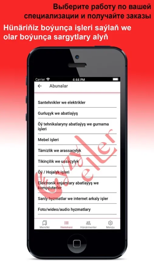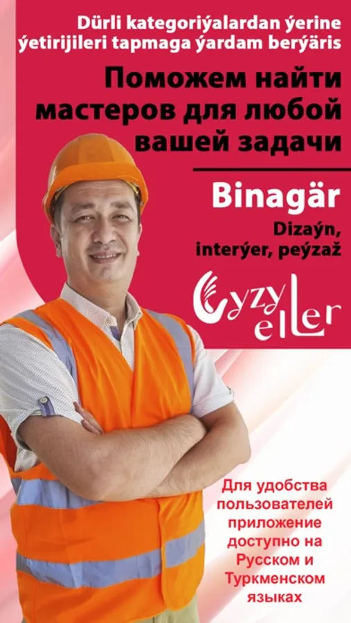 «Gyzyl eller» ulgamy, Size durmuşda we gündelik gerek bolan wajyp meseleleriniň giň toplumlarynyň çözgütlerini hödürleýär! Kondisioneriňiz döwüldimi, suw geçiriji gerekmi ýa-da öýi arassalamak üçin sargyt etjekmi, indi hünärmen gözlemeli däl, Siz diňe anketa ýazýaňyz - tejribeli hünärmenler özleri Size teklip bilen ýüzlenýärler. Biziň ulgamymyzda ussat ýa-da ýerine ýetiriji hökmünde hasapda durmak bilen, Siz dürli ýumuşlary özüňiz ýerine ýetirip bilersiňiz.