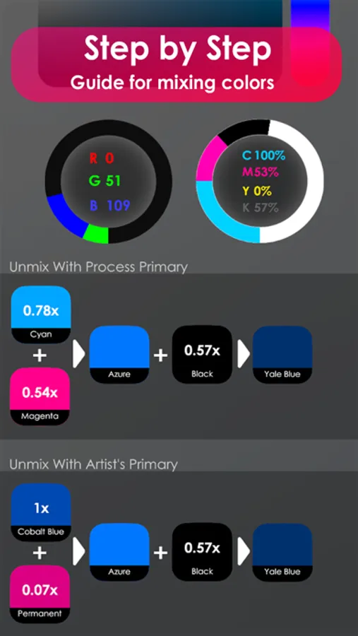 Mixer is a color mix simulator where you can mix commonly available watercolors and explore the results. Mixer will give you step by step instructions to recreate a color in real world using the colors in your watercolor palette.