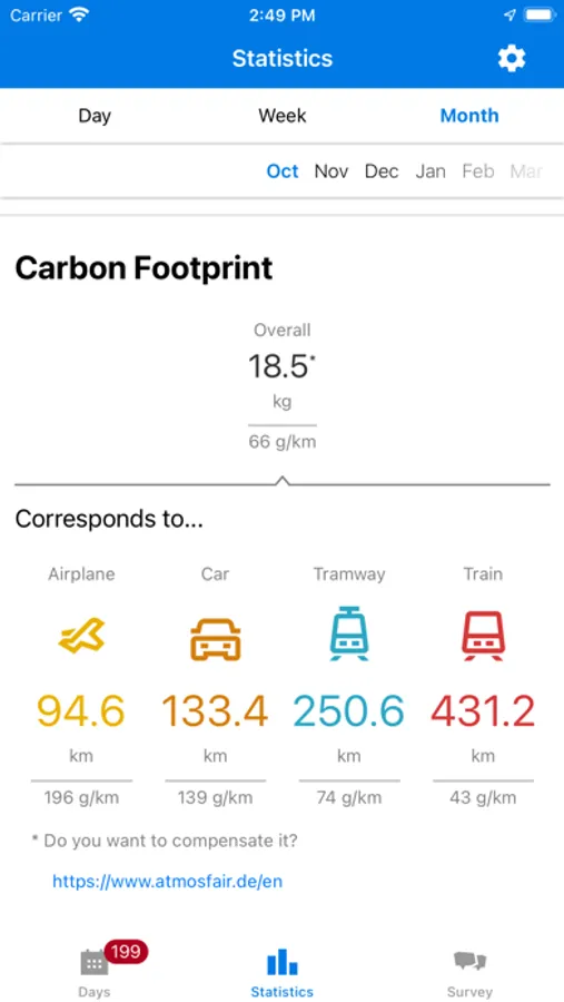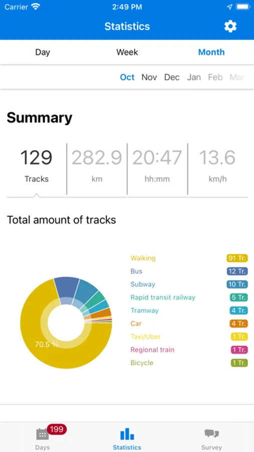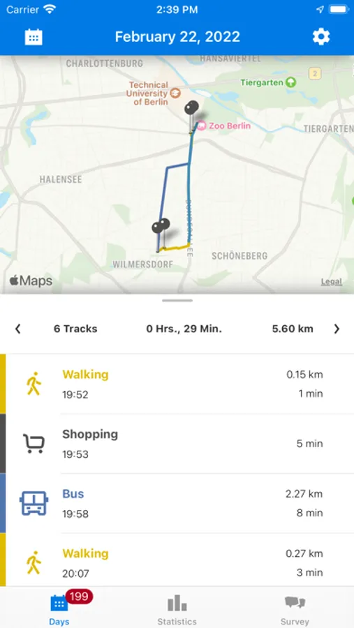 Use the calendar function to see where you have been on which day and which means of transport you used to get there. The map provides an overview of your trips and activities. The personal statistics show how much time you spend on your daily mobility, the distances you cover and which means of transport you use most frequently.