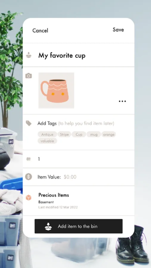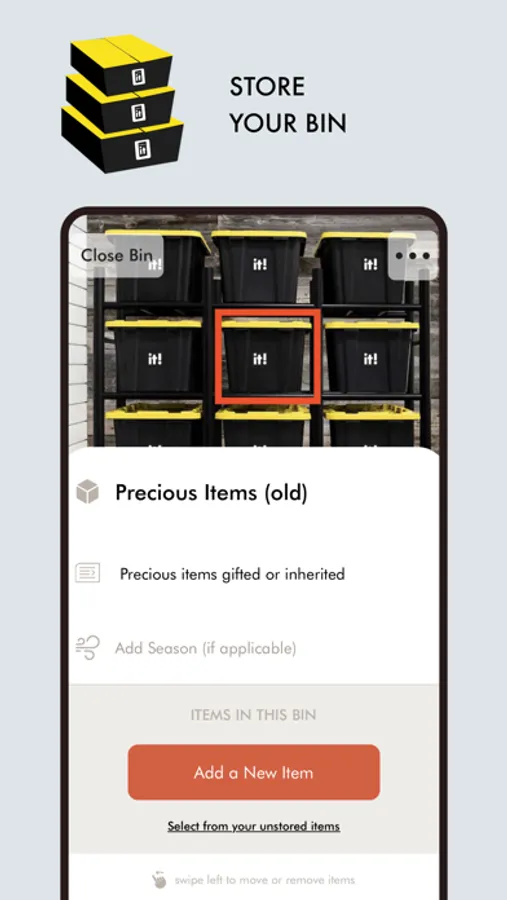 • ADD ITEMS: When you are ready to store your items, add each item to the bin by simply taking a photo or adding a description