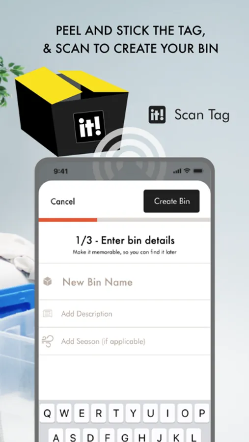 • CREATE BINS: Simply stick the intelligent tags on each of your bins and scan the tag with the app to add a bin description