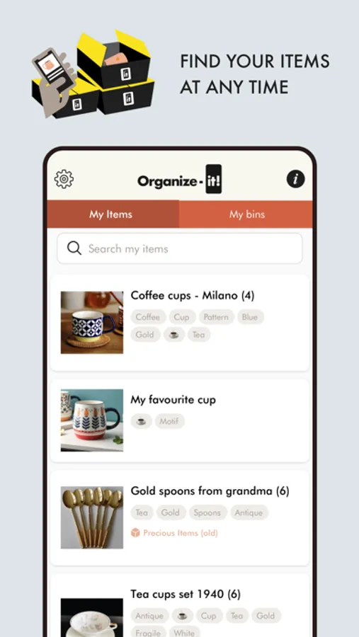 • FIND YOUR ITEMS: Later, you can use the the in-app search to quickly find where your items are stored.