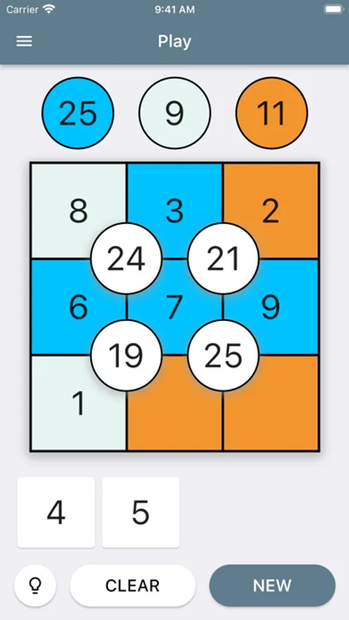 Place the numbers 1 through 9 on the grid, so the numbers in squares surrounding each inner circle sum to the number in that circle, and the numbers in squares of each shade sum to the number in the outer circle of that shade.