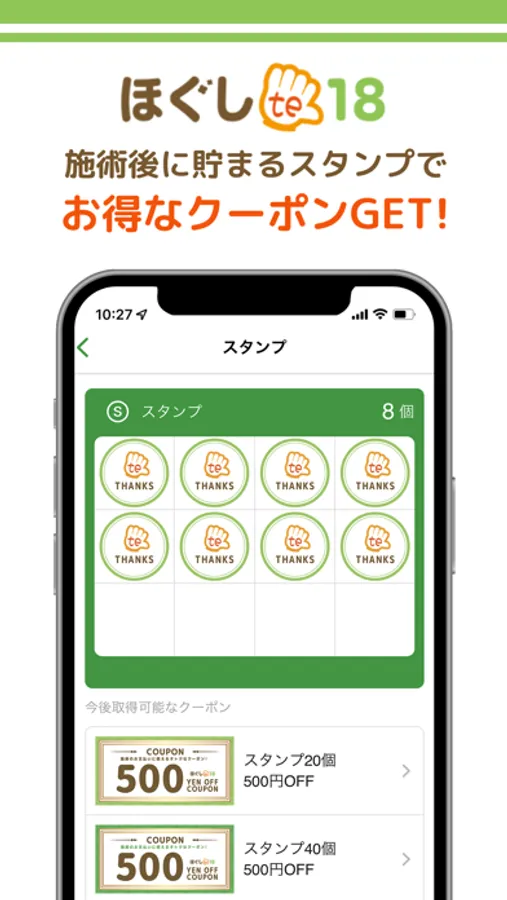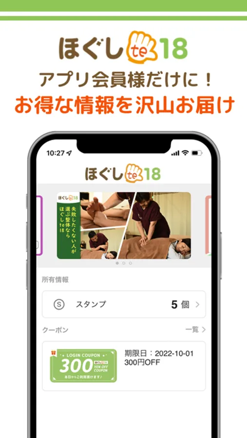アプリを通してほぐしte18の新着情報やお得な情報を受け取ることができます。また、いつでもお手元のスマートフォンから、メニューやご希望のお時間帯のチェック・ご予約などが可能です。アプリをインストールしていただくことによりほぐしte18を、より便利に身近にご利用していただけます。