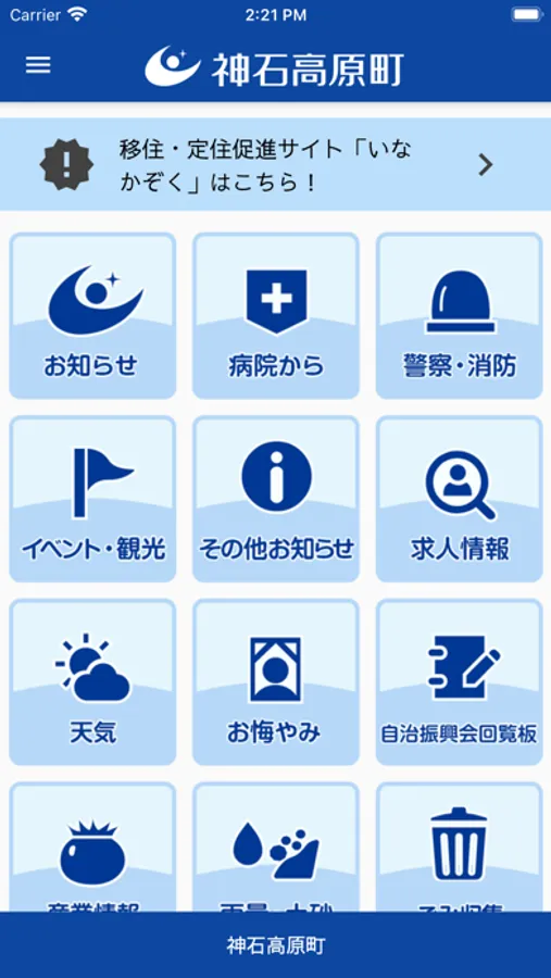 役場からのお知らせ、天気情報、各自治振興会の情報、ごみ収集日カレンダー、緊急情報などをご覧いただけます。