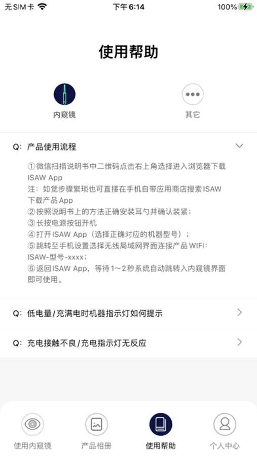 ISAW智能内窥镜是一种便携式、手持式,多功能监控、检查摄像系统,配备了强大的无线模式,提供了稳定的Wi-Fi连接系统。可以快速连接到手机、iPad等终端设备,用户通过该软件可以方查看视频画面,拍照、录像等。