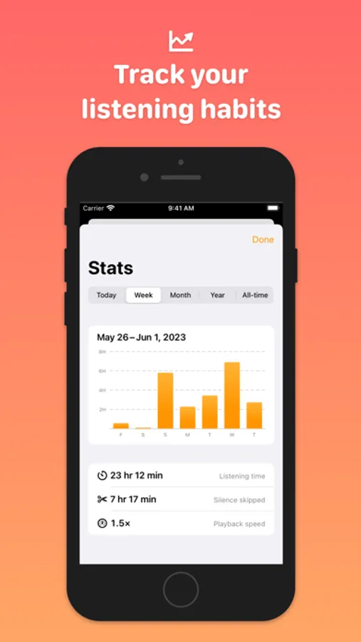 Track your listening patterns over time with a straightforward stats breakdown for today, the past week, past month, past year, or all-time.